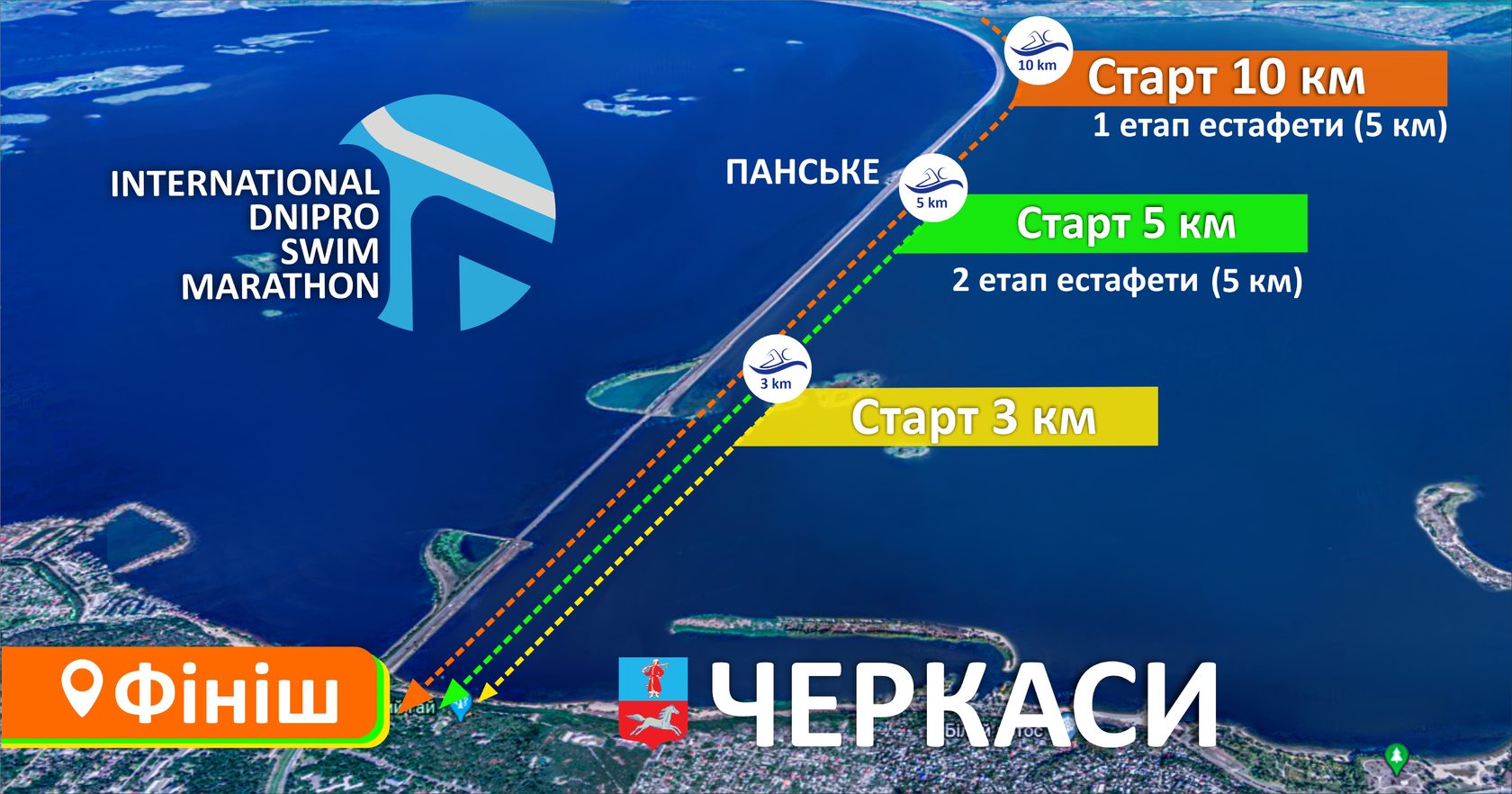 Старт основной дистанции заплыва - 10 км происходит на левом берегу Днепра спортсмены переплывают акваторию в самом широком ее месте и финишируют на правом берегу в Черкассах. Вся дистанция пролегает вдоль самой длинной дамбы Украины.